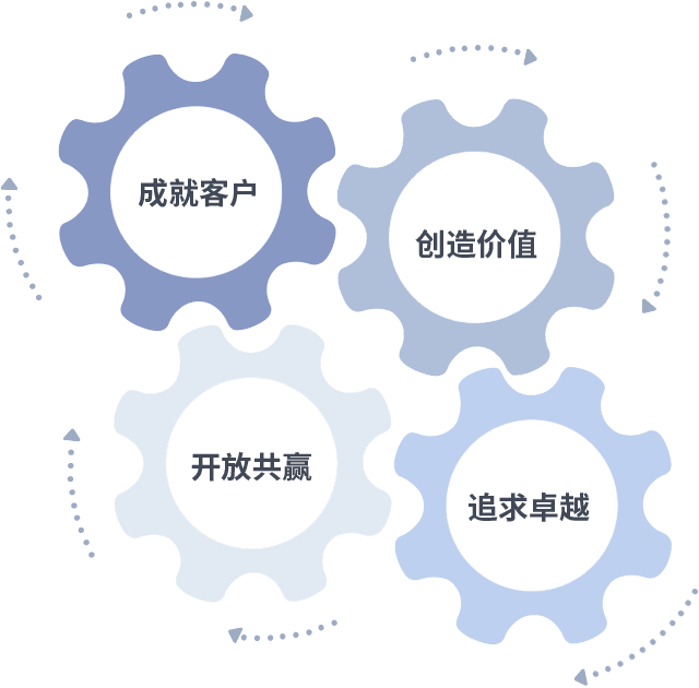 成就客户是一切决策的出发点,,创造价值是衡量所有工作的标准,,追求卓越是我们做事做人的态度,,开放共赢是我们的格局也是最终的结果。。。。价值观的齿轮环环相扣,,推动着组织里的每个人不断向前。。。。