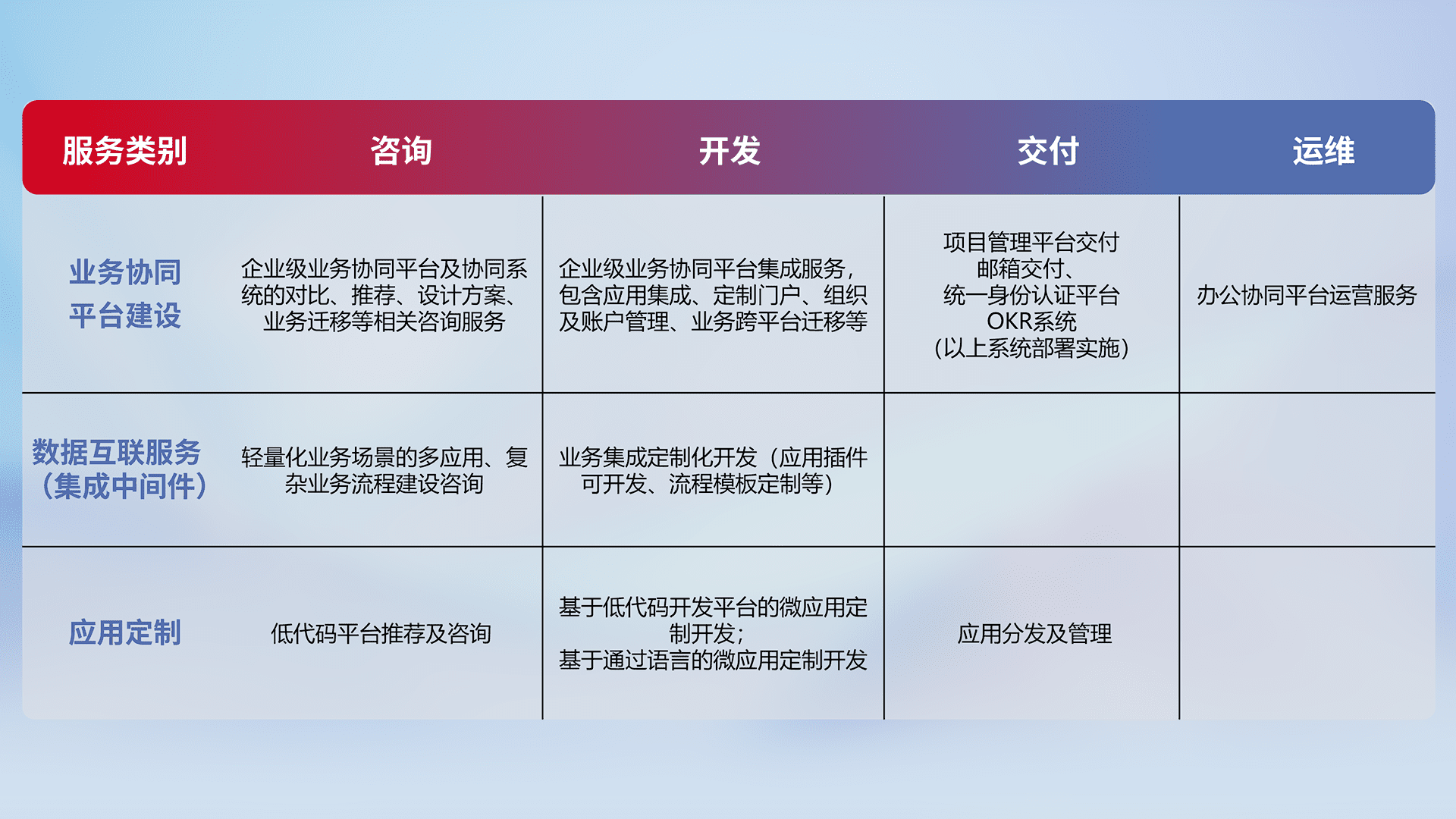 针对钉钉、、企微、、、、IDaas等平台级产品提供产品的规划、、方案、、交付、、、、定制化开发等服务,,,,实现如统一协同办公、、、智能客户服务、、、、混合会议管理、、、智能数据查询、、等业务场景,,,,实现数字化转型。。。。