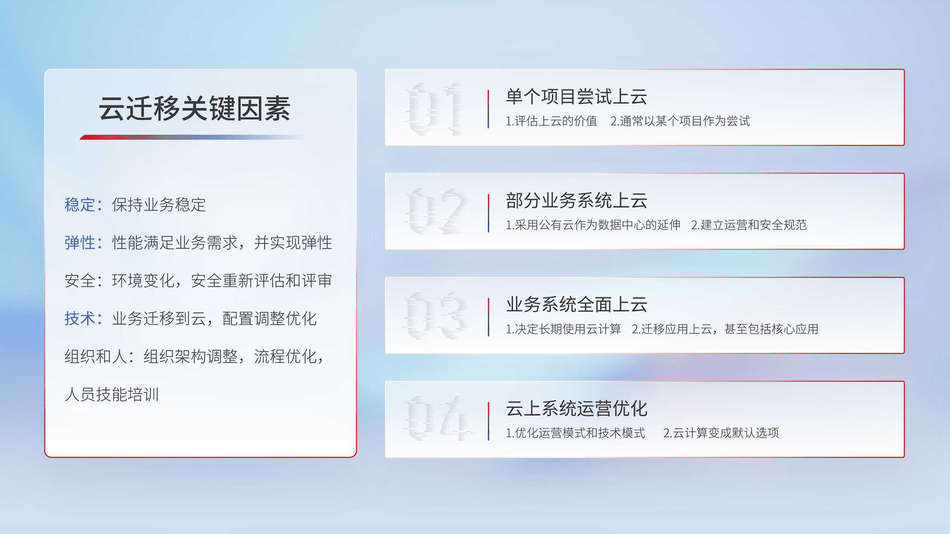 结合实际业务,,,从规划设计、、、、云平台选型、、云原生改造、、、、数据迁移、、、集成交付,,,迁移全过程为客户识别最佳上云路径,,做好风险识别管理,,设计网络架构、、、、身份权限、、、安全审计合规、、、操作审计、、、、日志审计、、、、监控告警策略、、多站点容灾设计等,,,对云上基础设施进行整体规划,,,,提升IT治理水平,,以满足弹性、、、高可用、、、高性能的需求。。。。