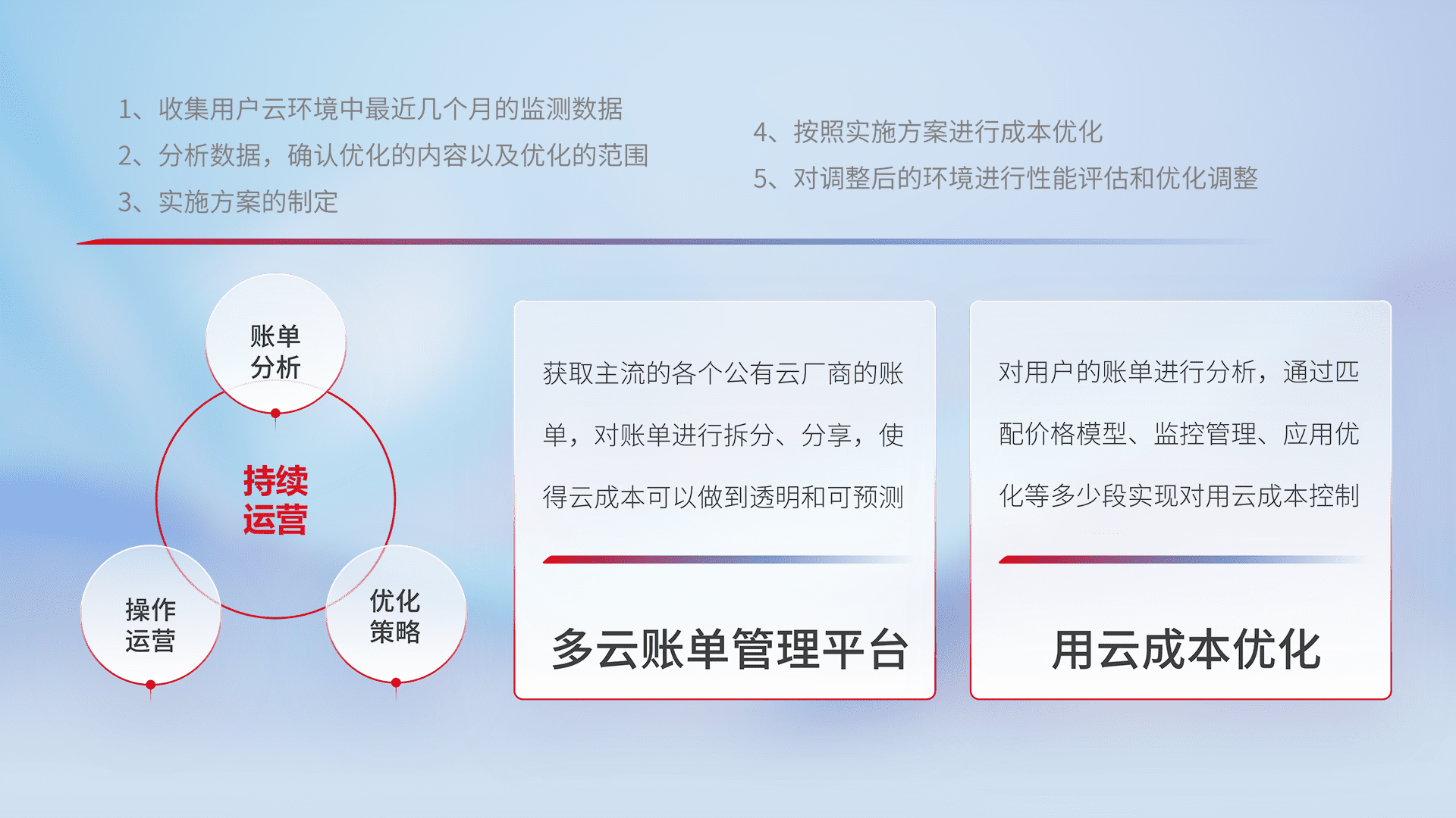 通过多云纳管,,以统一的资源数据模型把客户的云资源进行抽象和封装,,,进而实现对多云资源的统一操作,,保障云资源管理的可靠性、、稳定性与可用性。。。量身定制化运维内容,,,,配置、、、开发运维、、补丁管理、、、备份、、、、监控、、认证和访问管理、、、、审计和日常巡检等,,,,保障在用云过程中的可靠度,,,,稳定度以及高可用率。。。